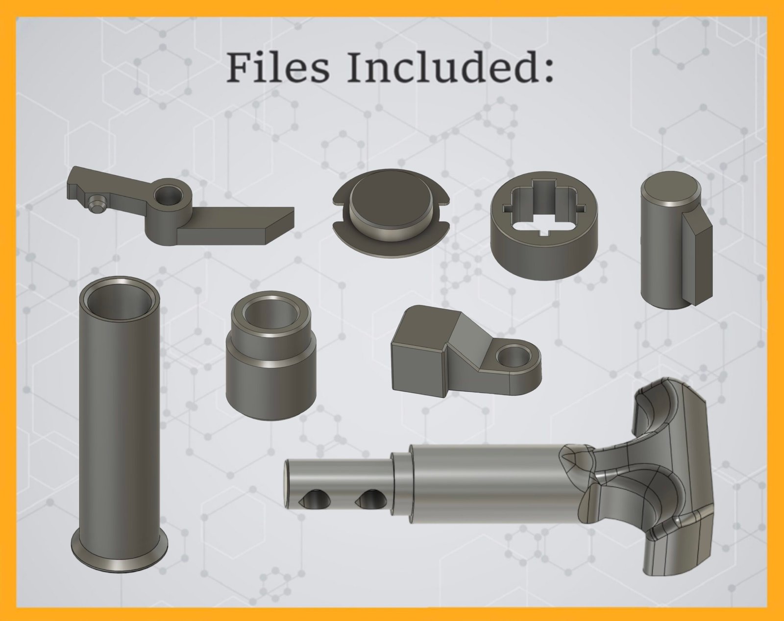 These are digital files for an Ejector Shell mod kit which adds a t-pull, dead space fillers, and an upgraded half dart compatible shell to a stock Ejector Shell