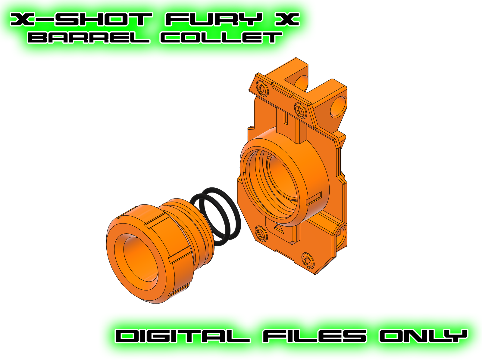 This drop in mod kit for the X-Shot Fury X I designed allows you to use your own barrel using an innovative dual o-ring collet without sacrificing the aesthetic of the original design. The dual o-ring collet offers superior barrel retention while maintaining the ability to quickly swap to a different barrel at any given time with zero tools.