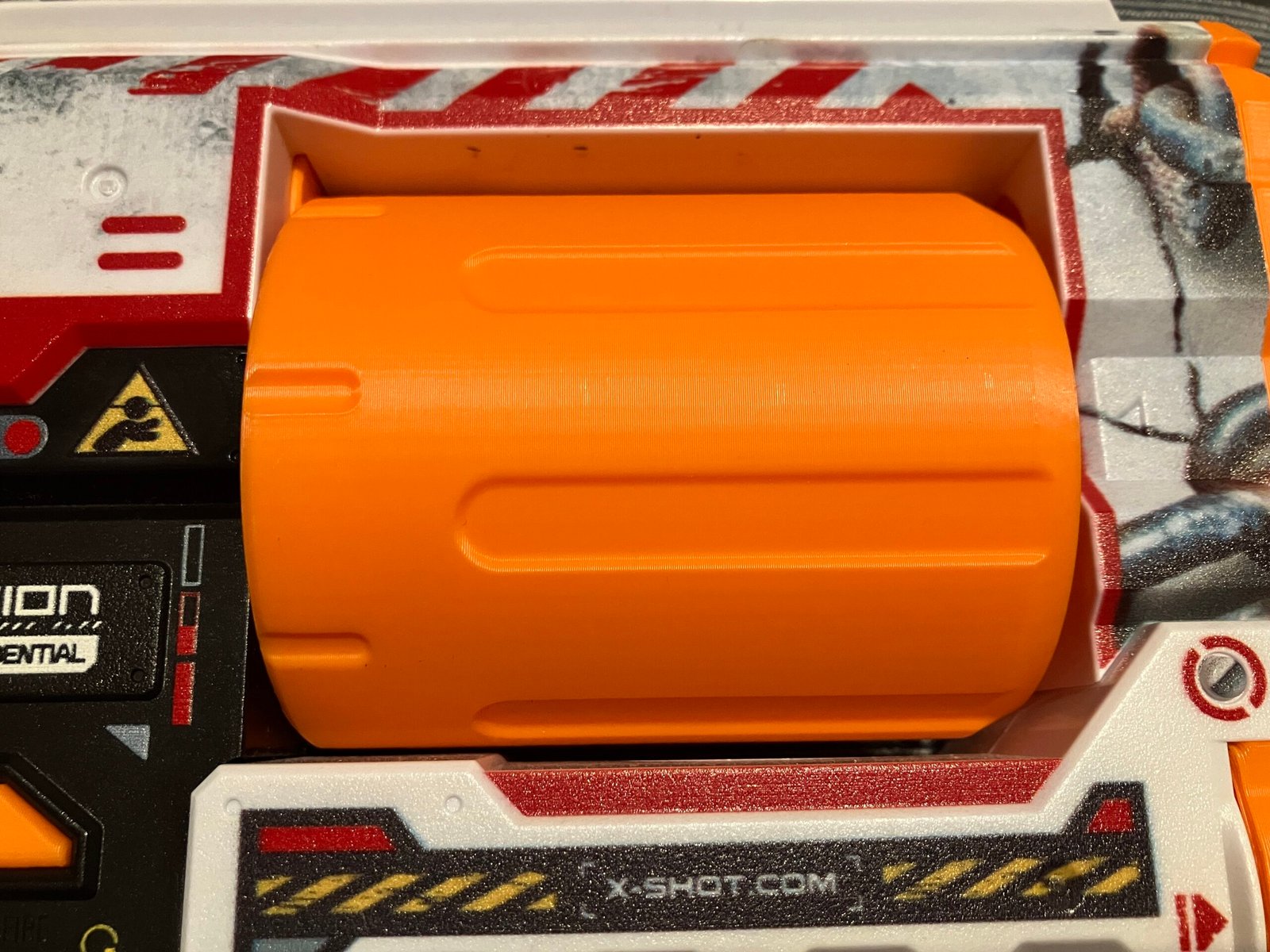 An easy way to double the amount of shots the Lock Blaster can hold, allowing it to fire 16 half darts. The cylinder can also still fire 8 full length darts and is a drop-in part for the stock blaster with no additional hardware required. Fully compatible with the Lock Blaster mod kit and minimisation kit (sold separately). Performance when used with a 6kg Strongarm spring is 95-100fps for the first row of darts and 105-110fps for the second row of darts (slightly lower if not using the extra parts from the Lock Blaster mod kit).
