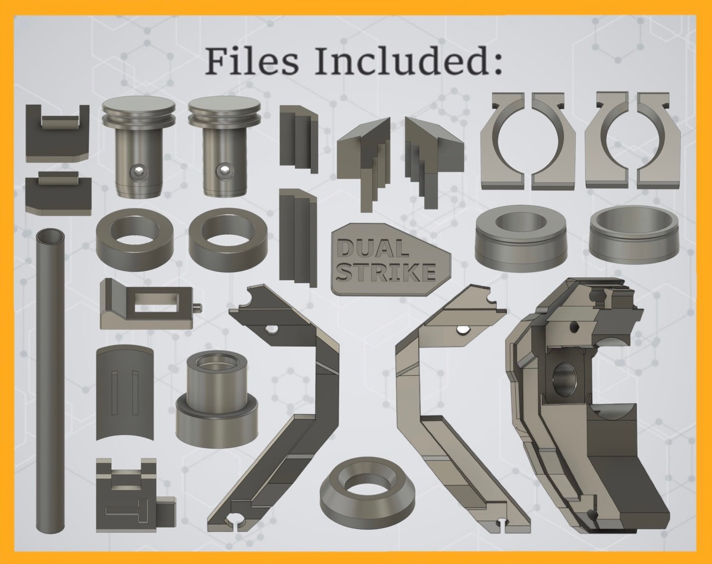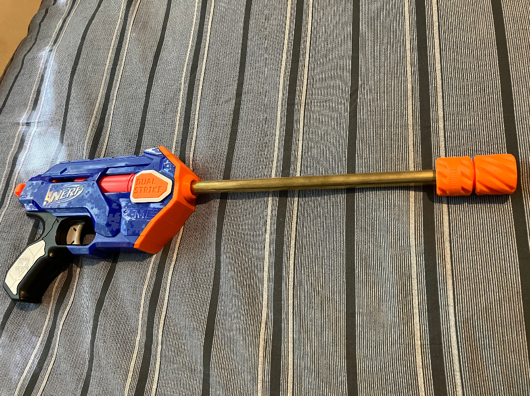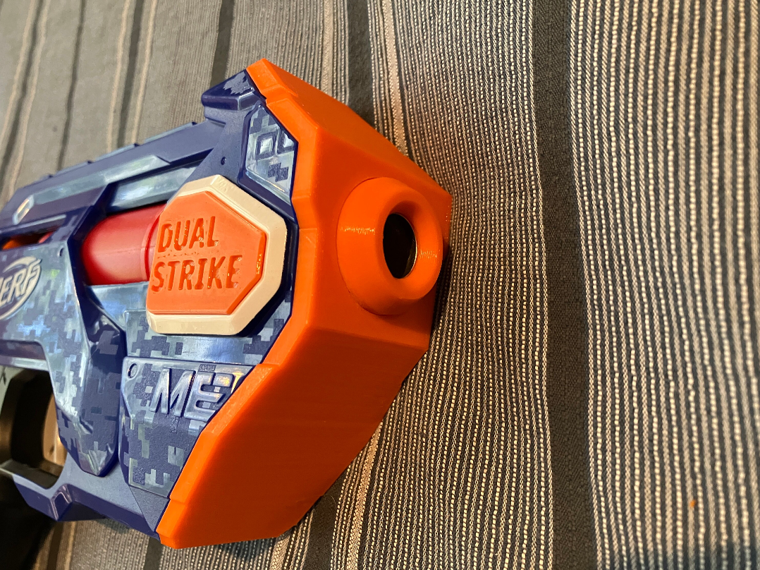 These are digital files for a Dualstrike mod kit which adds a minimised front end, single shot barrel and reinforced internals to a stock Dualstrike