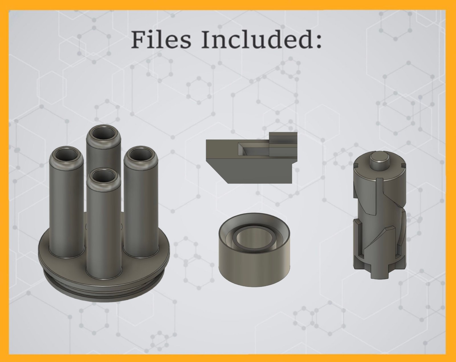 These are digital files for a Tripleshot mega XL cylinder kit which adds an 4 shot mega XL dart cylinder to a stock Tripleshot