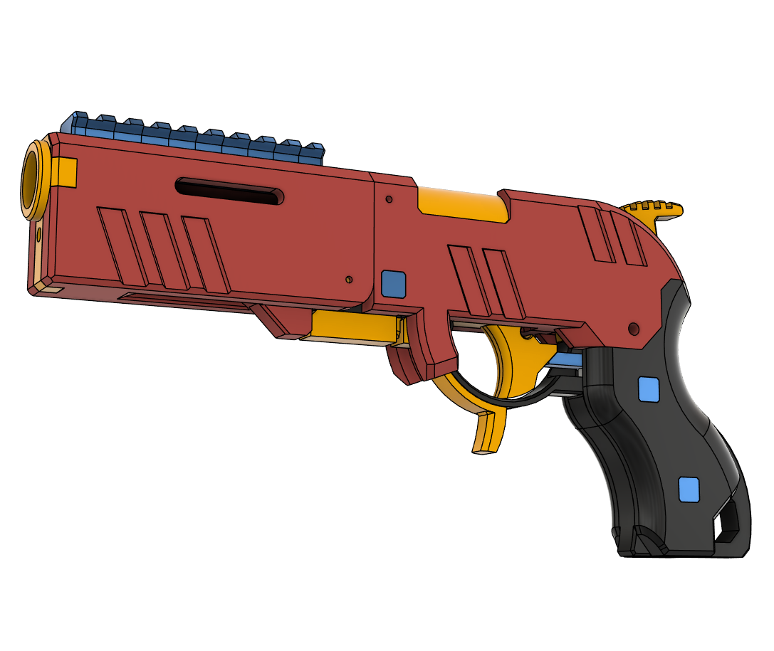 This is a single-action blaster (meaning you have to prime it with the hammer, so you can then fire) with a break-open barrel that uses the inline shells (3 darts) you already know from previous reshells.